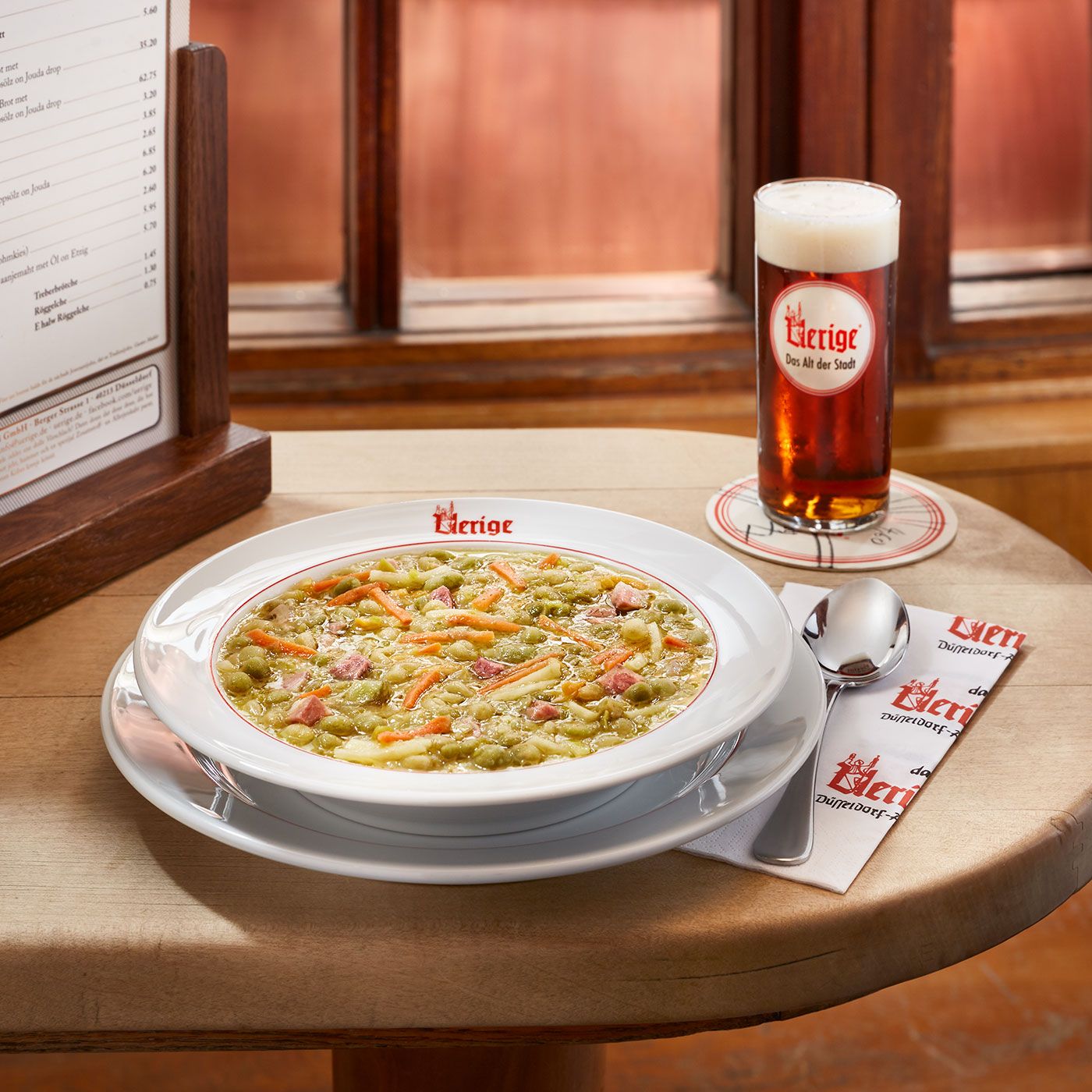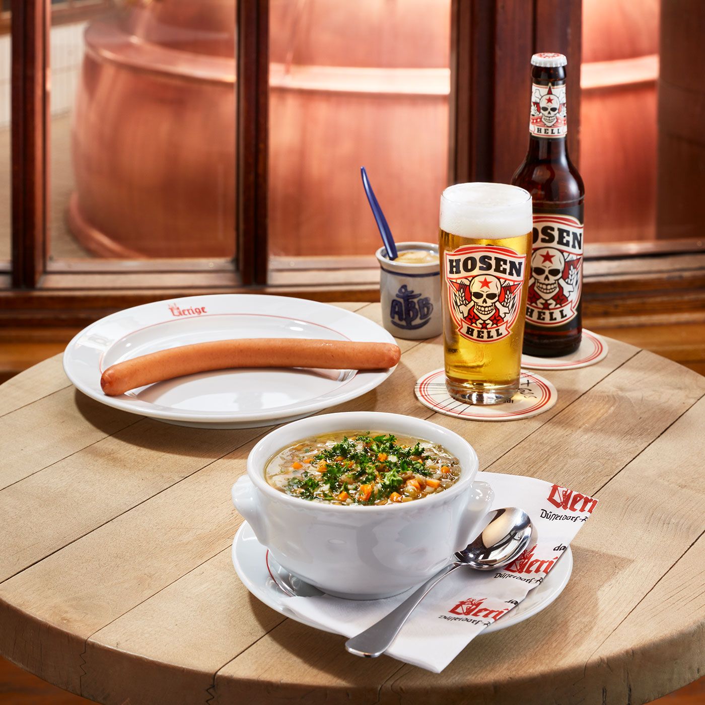 This is how we cook lentil soup at the Uerige: thoroughly soak the lentils in cold water over night. Finely dice the washed and trimmed soup vegetables, then cook them in the stock, adding the soaked lentils, pork, and herbs, until the vegetables are cooked and the lentils tender. Season to taste – now the lentil soup is ready to be enjoyed.