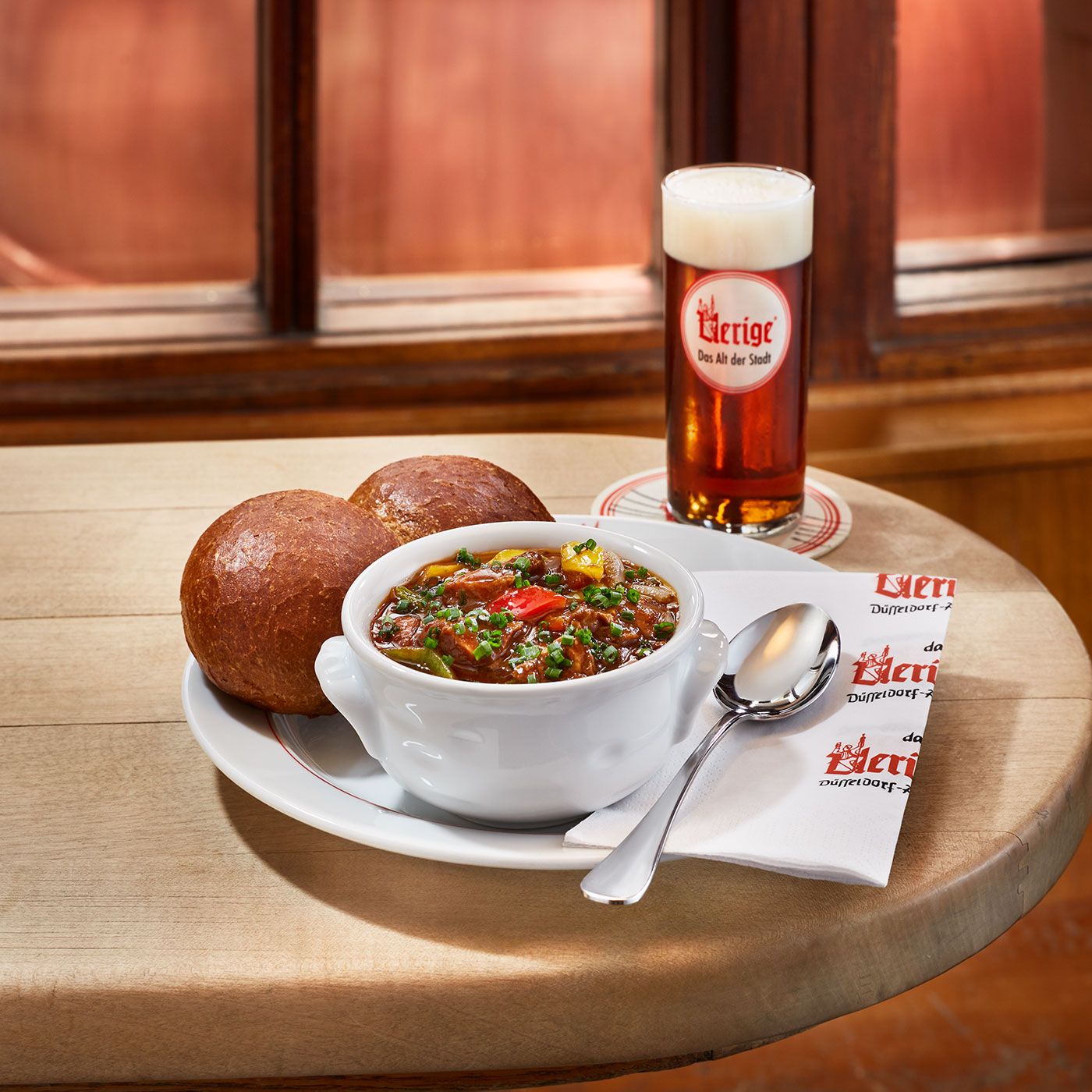 At the Uerige, of course we also offer delicious hearty food to be washed down with the yummy droplet.