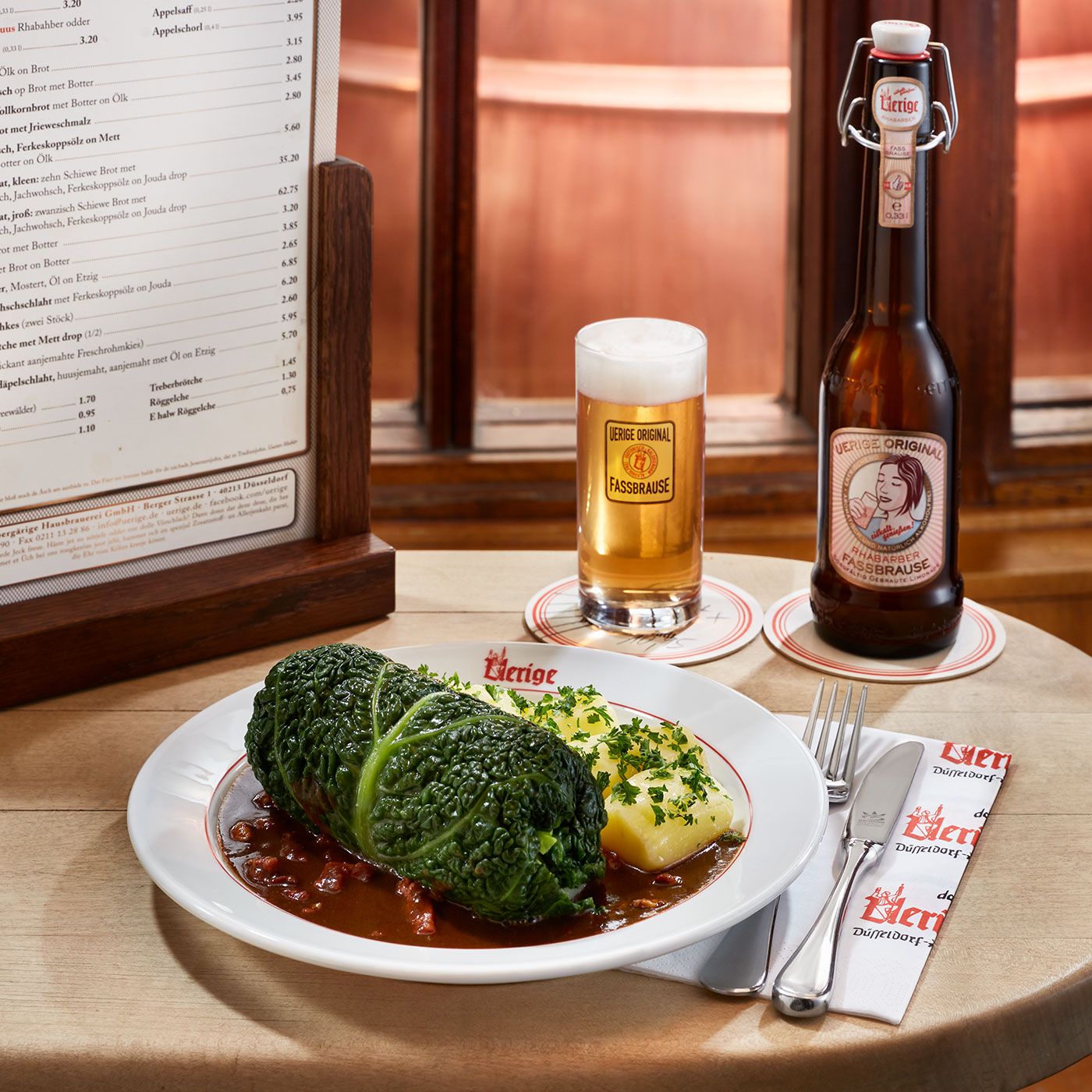 This is how we do it at the Uerige: halve the savoy cabbage, cut out the stalk. Loosen the leaves and rinse, then briefly blanch them. Mix the ground meat with onions, white bread crumbs, herbs, mustard, and tomato ketchup, then form this into a longish roll and wrap a generous amount of savoy leaves around the meat mix. Cut the pork into fine cubes and fry, then add chopped onions and some jus to create a nice gravy sauce.